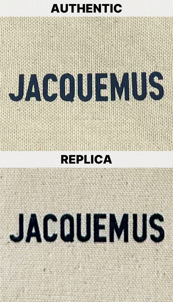 The dust bag offers another clue for identifying a replica. The authentic Jacquemus dust bag features a clean, bold print with precise font weight, whereas the replica print often appears overly bold and lacks the refinement of the original. The letter “A” in the Jacquemus logo on the replica has a smaller inner triangle, and the print itself can appear muddy with inconsistent font weight. Additionally, the fabric of the dust bag feels thinner and lacks the textured, high-quality material of the authentic version.