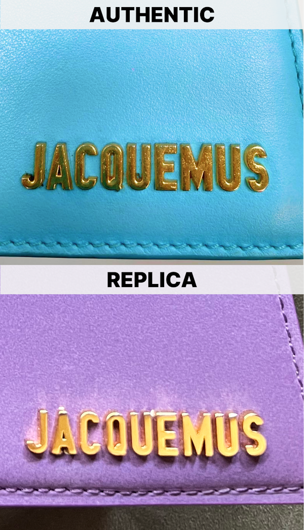 The gold Jacquemus logo on the front of the bag is a signature feature that reveals important differences. On the authentic bag, the logo is crisp, with smooth edges and a refined gold tone. The replica logo, however, is overly bold, particularly visible in the smaller inner triangle of the letter “A.” The replica’s gold finish is also shinier, lacking the luxurious matte effect of the authentic