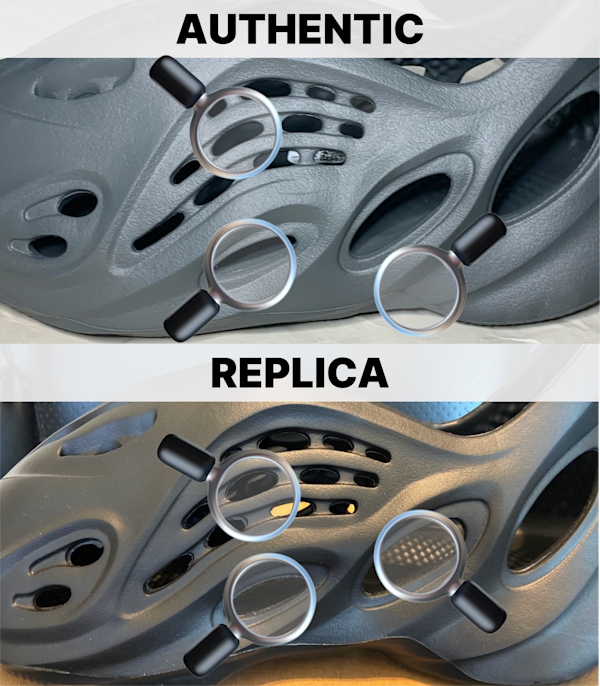 Material: The authentic Foam Runners are crafted from a superior EVA algae foam, offering a lightweight yet durable build. Counterfeits often use a lower quality rubber, compromising both comfort and durability.