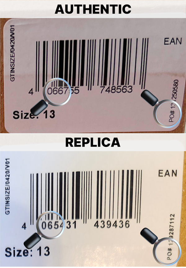 Googling the barcode of the authentic model yields specific information about the runners' colorway, but searching the fake barcode often returns no specific results. However, this may vary with different quality levels of counterfeits, and since boxes and stickers are easier to replicate than shoes, this method isn't the most reliable for authentication but still provides useful insights into counterfeit production.