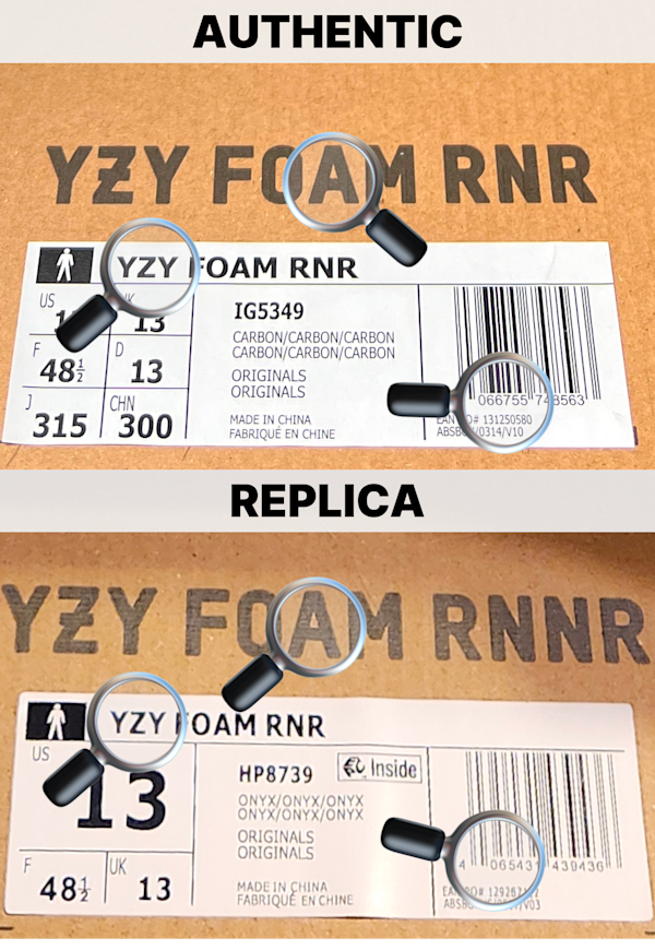 The authentic YZY FOAM RNR box features vibrant, solid printing, unlike the faded appearance of counterfeit versions. Additionally, the sticker text on genuine boxes is consistently bold and even, setting it apart from the variable font quality seen on fakes.