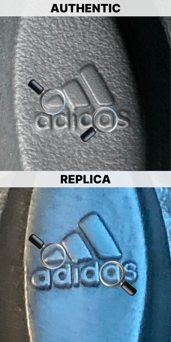 The Adidas logo engraved on the heel is a clear, sharp feature on authentic shoes, displaying the quality and precision of real products. Counterfeit versions tend to have logos that are too large and text that appears too thick and uneven.